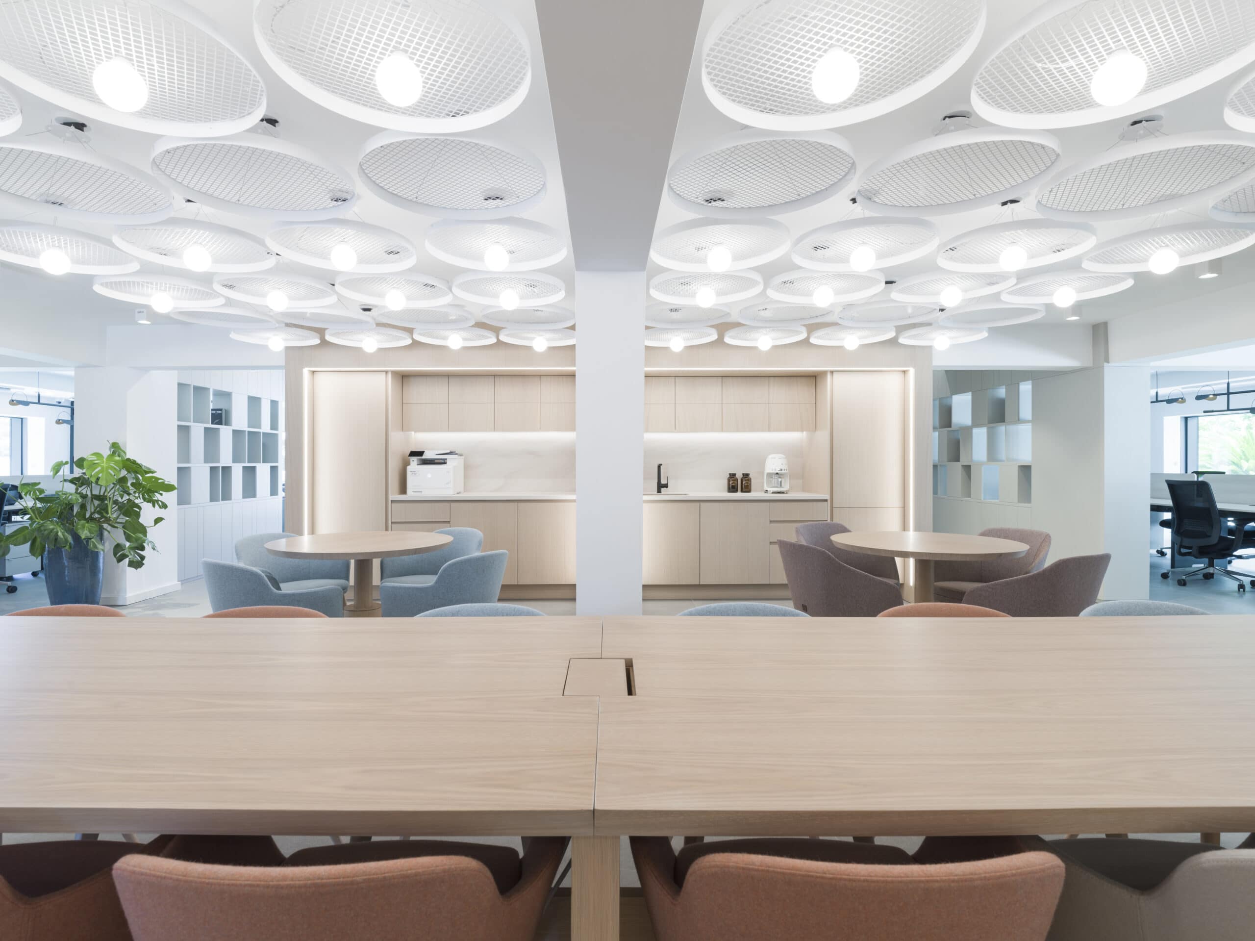 Natural tones, oak finishes, and controlled lighting create a focused working atmosphere.