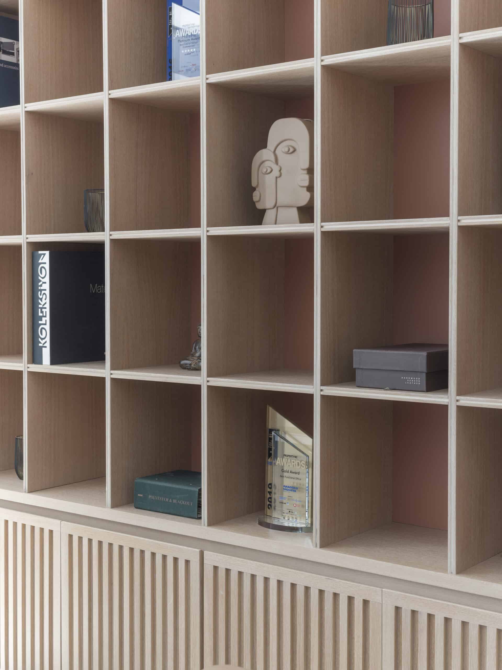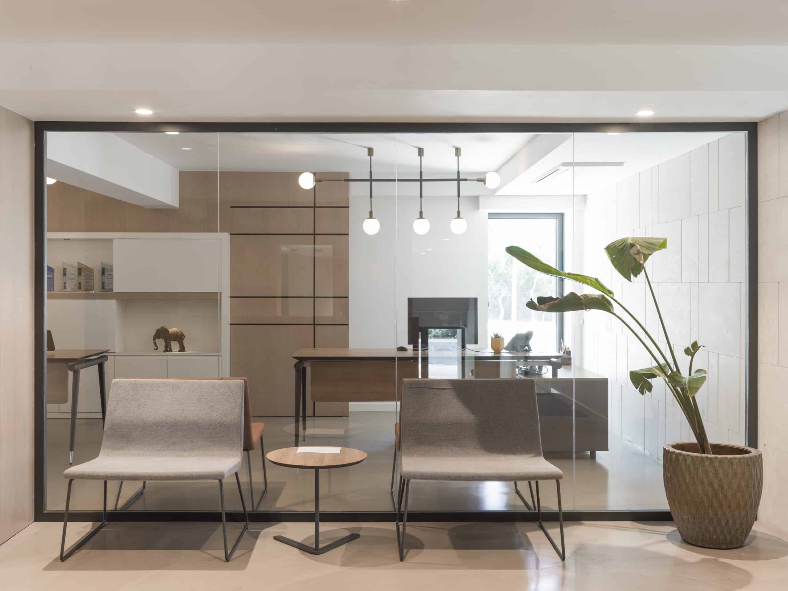 Interiors combine functionality with understated elegance. Natural tones, oak finishes, and soft lighting create a calm yet focused working environment.