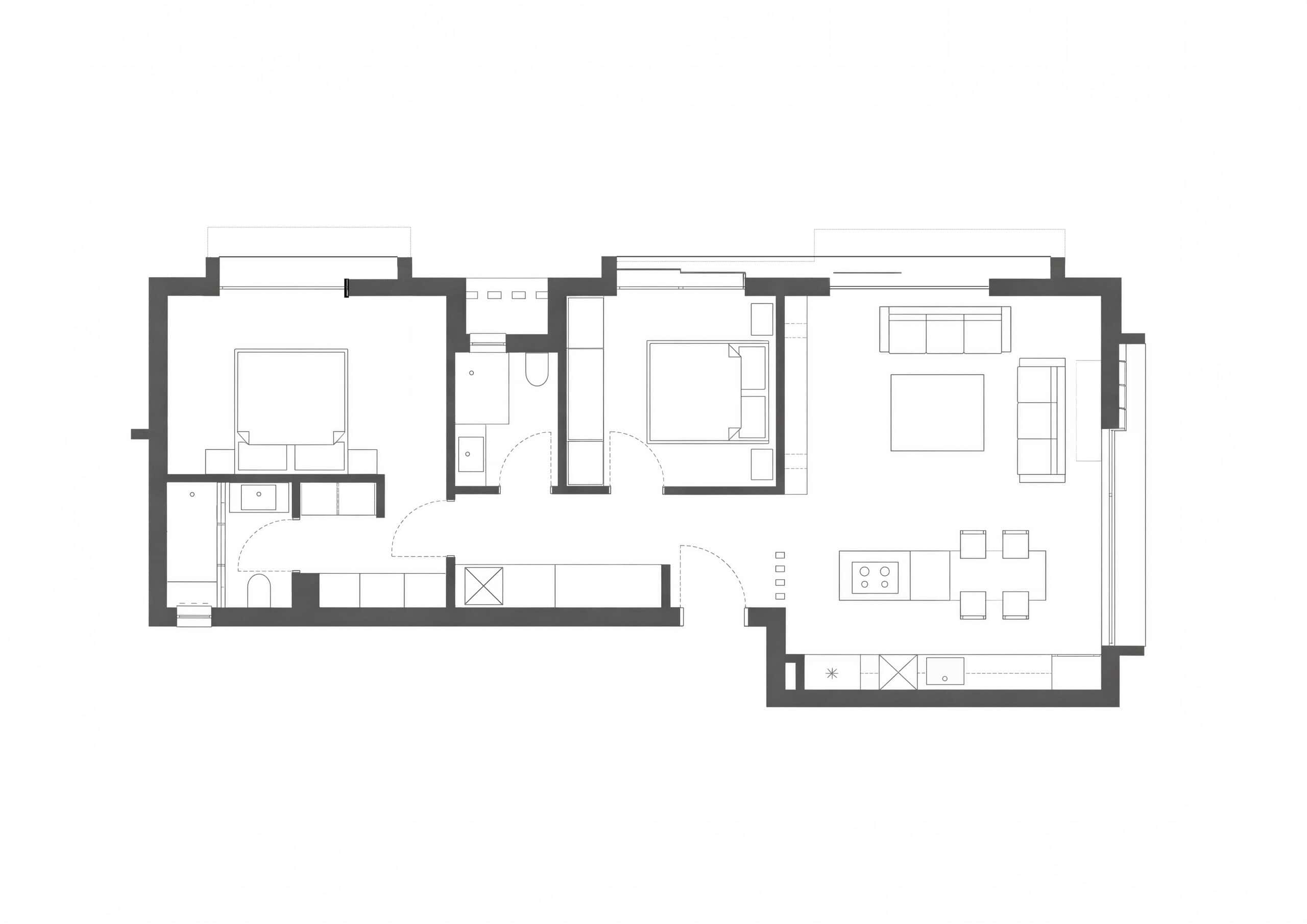 With a gross internal area of 118 m², the residence features an open-plan living and kitchen area, a spacious master bedroom with an en-suite, a second bedroom, and a shared bathroom. Floor-to-ceiling glazing enhances natural light, while French balconies and private outdoor connections strengthen the dialogue between indoors and landscape.
